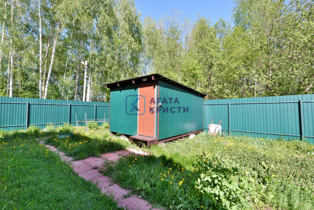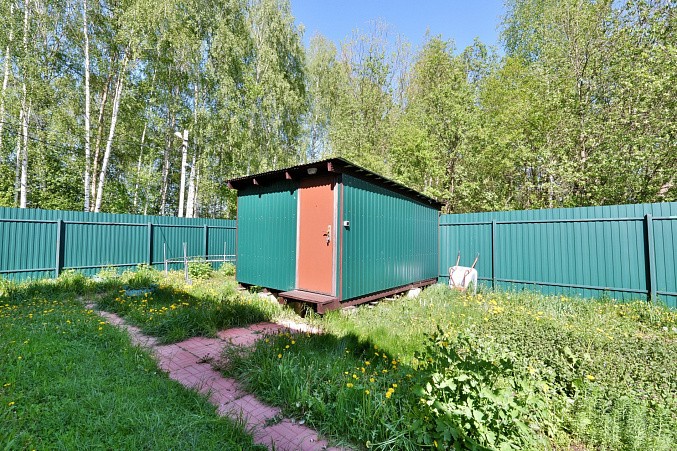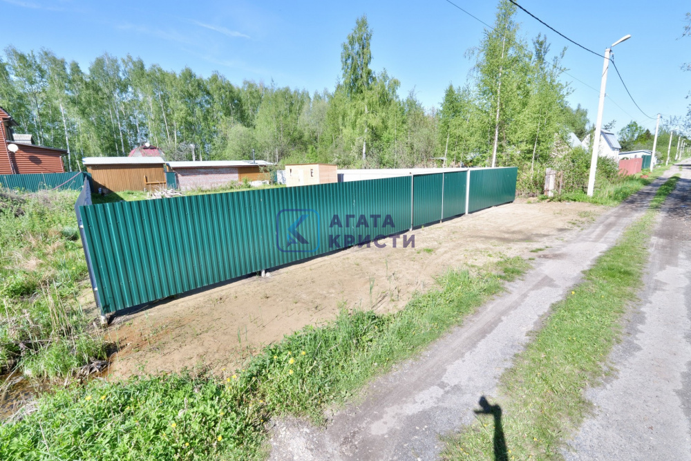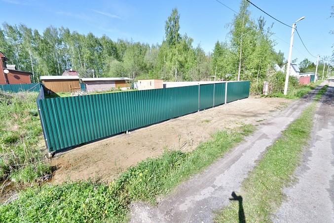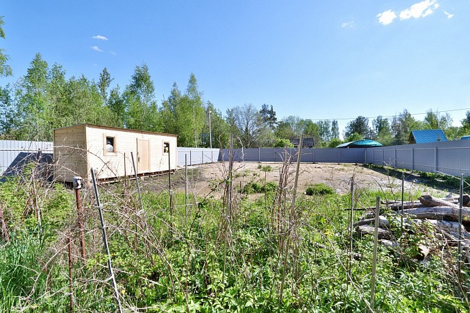 На второй половине участка расположен хозблок, участок очищен, отсыпан, канализация, забор и въездные ворота из профлиста, канава для отвода воды.