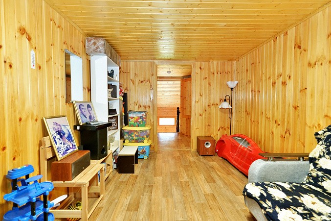 Двухэтажный дом - ленточный фундамент, каркacнo-щитовoй, обшит сайдингом снаружи, качественной вагонкой внутри, крыша – металлочерепица, установлены окна ПВХ.