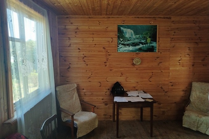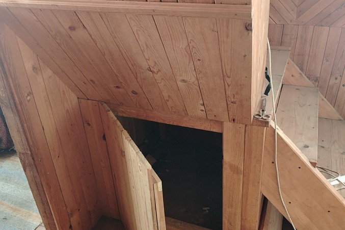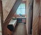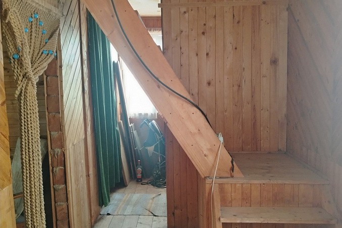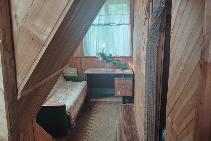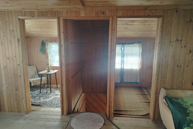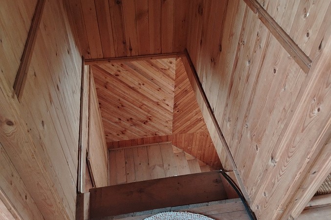 Деревянная лестница ведёт на второй этаж, где расположена общая гостиная, из которой можно попасть в две изолированные комнаты.