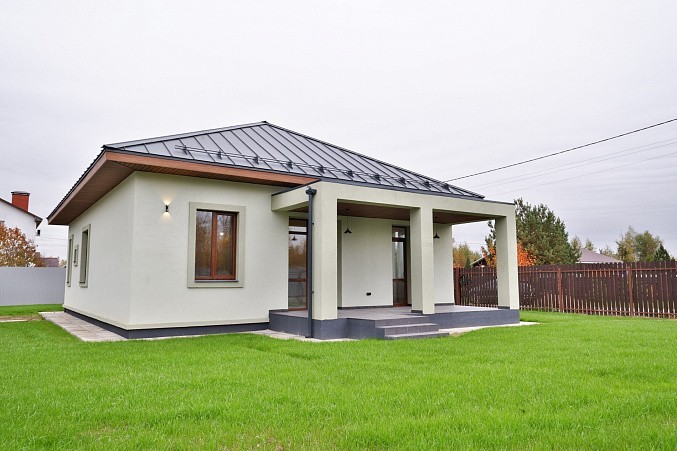 Дом построен на монолитной плите. Стены из пеноблока 400 мм + штукатурка Ceresit. Установлены энергосберегающие окна. Красивая фальцевая кровля.