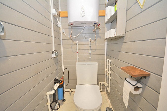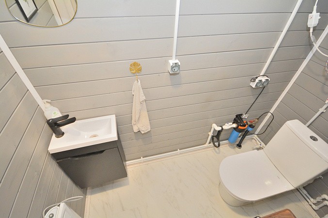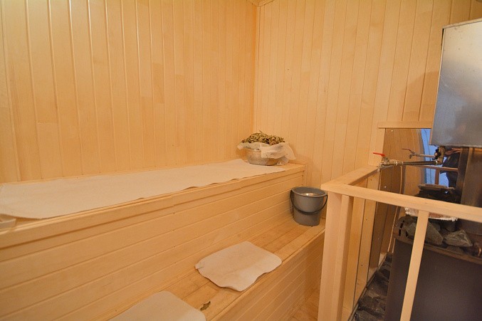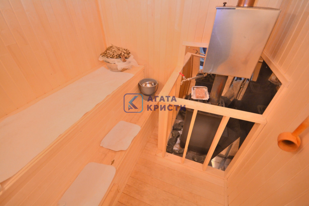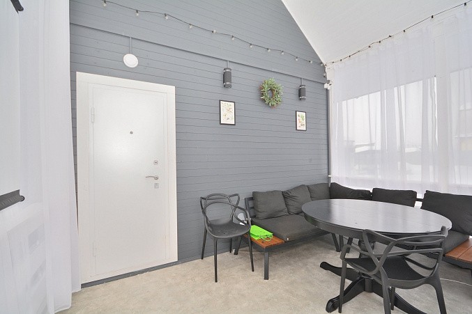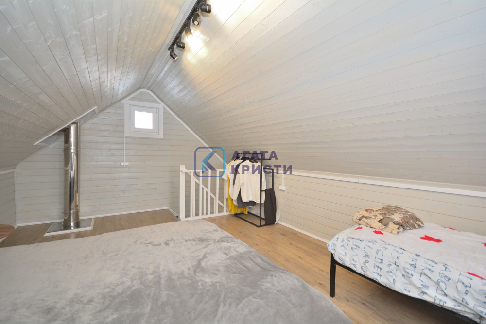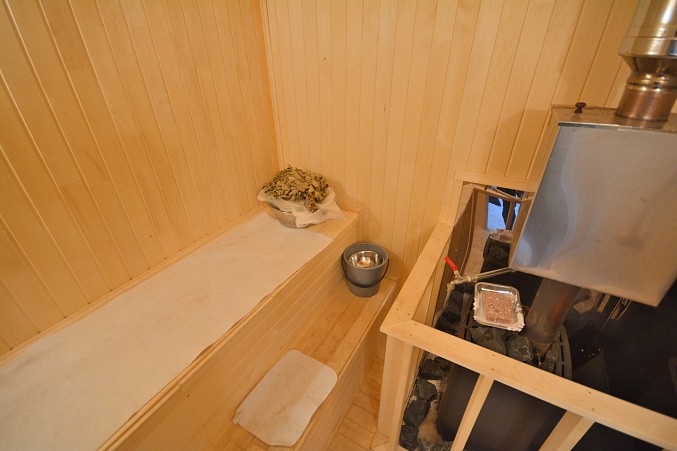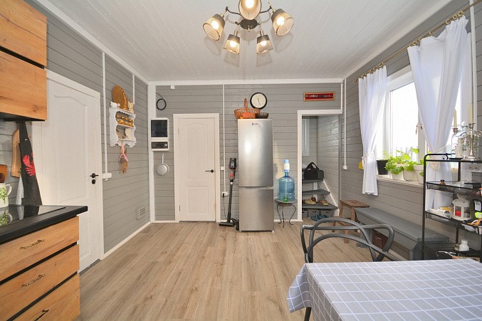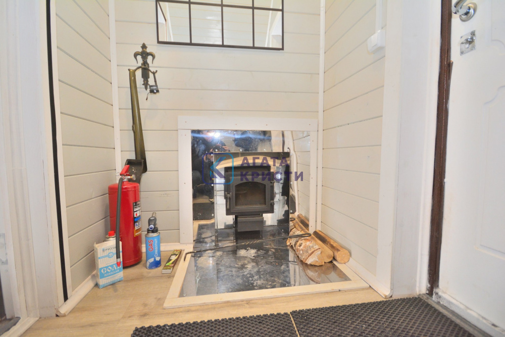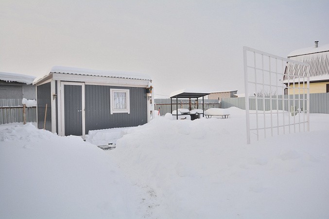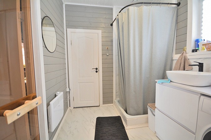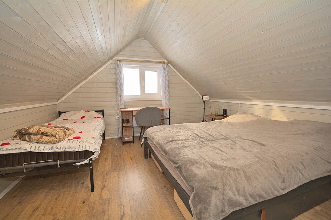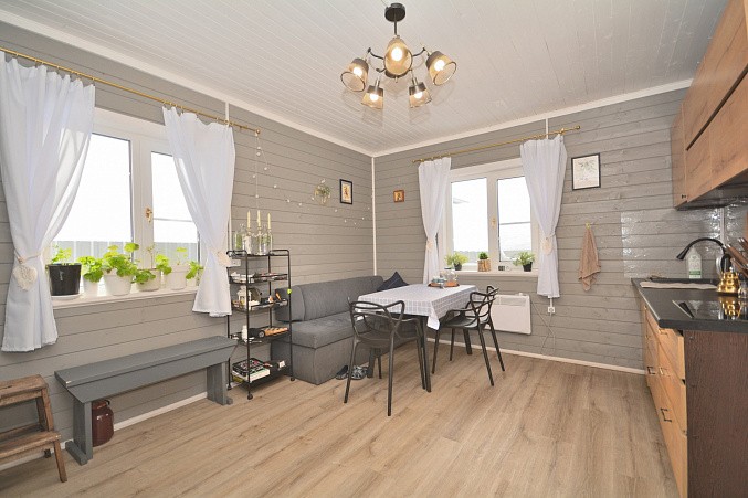 В доме при входе открытая терраса, на первом этаже кухня-гостиная, парная, моечная, санузел, на втором этаже жилая комната. Дом отапливается конвекторами.