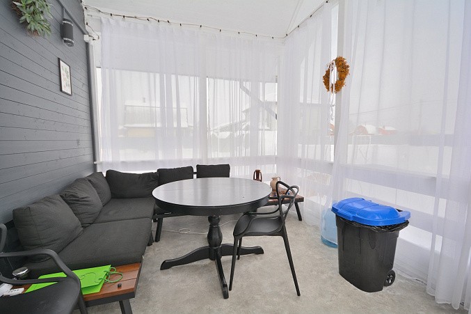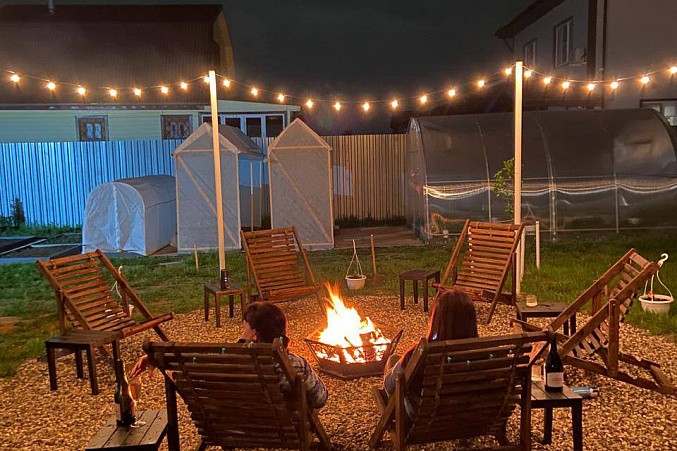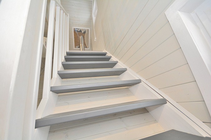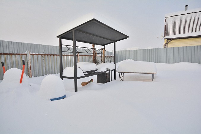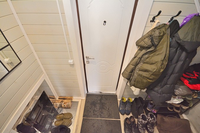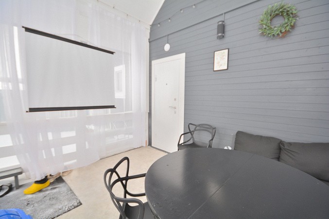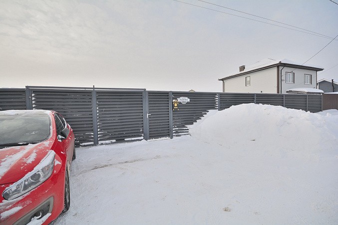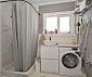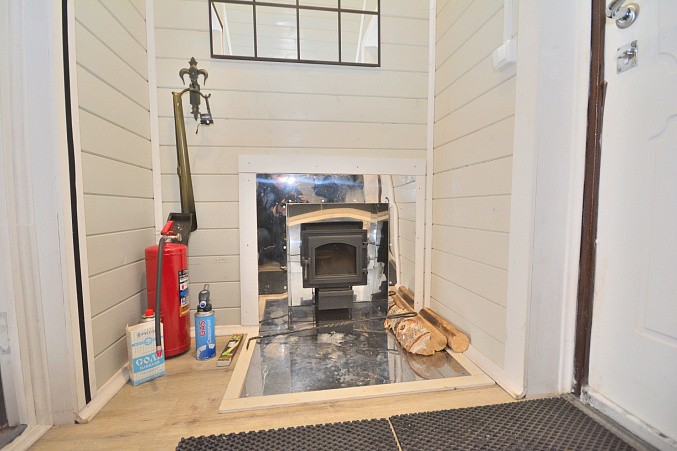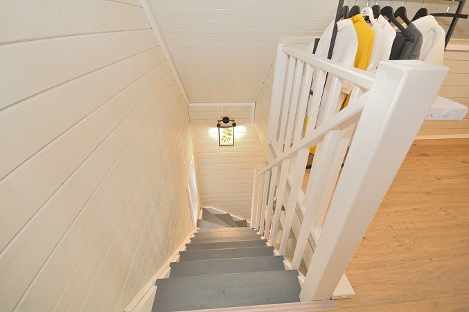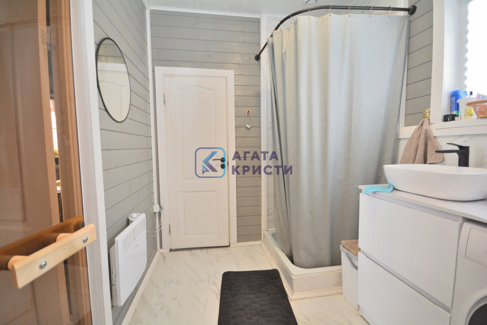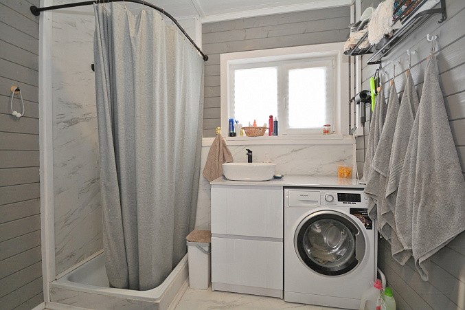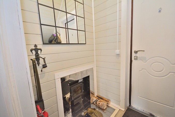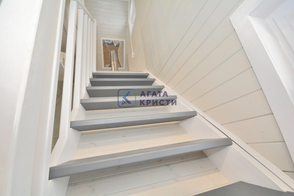 В доме при входе открытая терраса, на первом этаже кухня-гостиная, парная, моечная, санузел, на втором этаже жилая комната. Дом отапливается конвекторами.