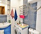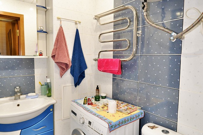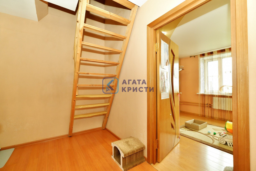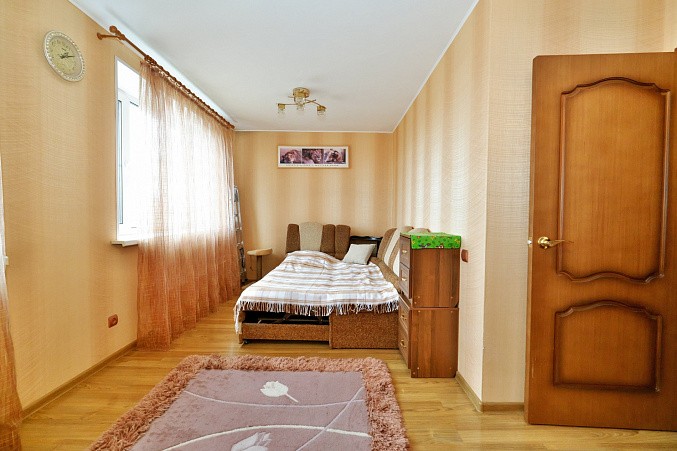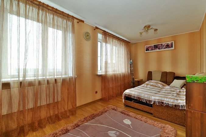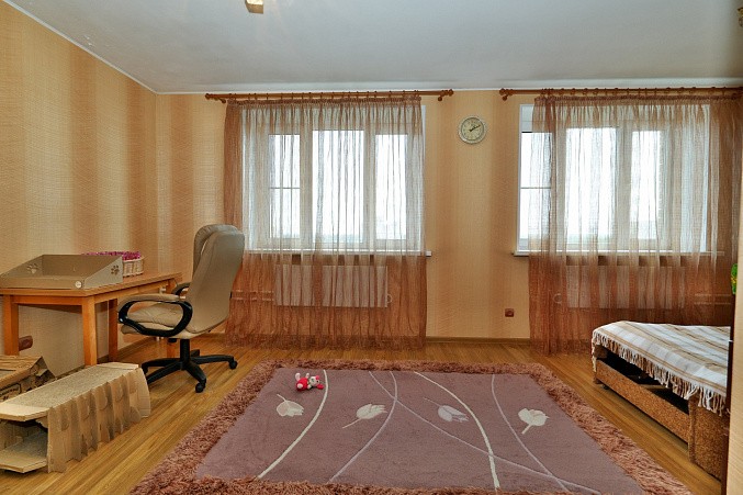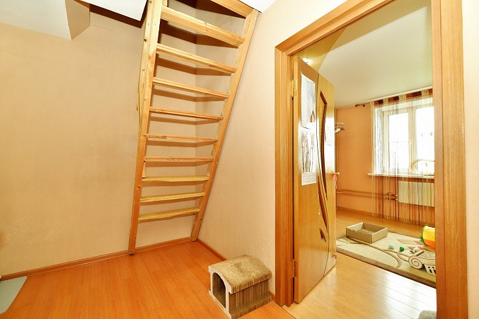Квартира расположена на 9 и 10 этажах. На нижнем этаже расположена просторная гостиная 22 кв.м, кухня 11.2 кв.м с выходом на застекленную лоджию, совмещенный санузел. На верхнем этаже две комнаты 15.7 и 15.1 кв.м и раздельный санузел. Верхний и нижний этажи имеют выходы. Основной вход в квартиру расположен на нижнем этаже. Также в пользовании находится подсобное помещение около 20 кв.м - тамбур. Верхний этаж также имеет выход в отдельное подсобное помещение. Большое количество мест для хранения - велосипеды, резина, коляски и т.д.