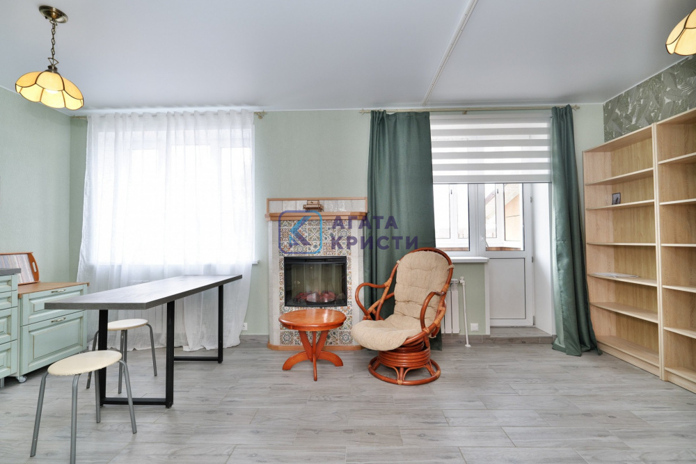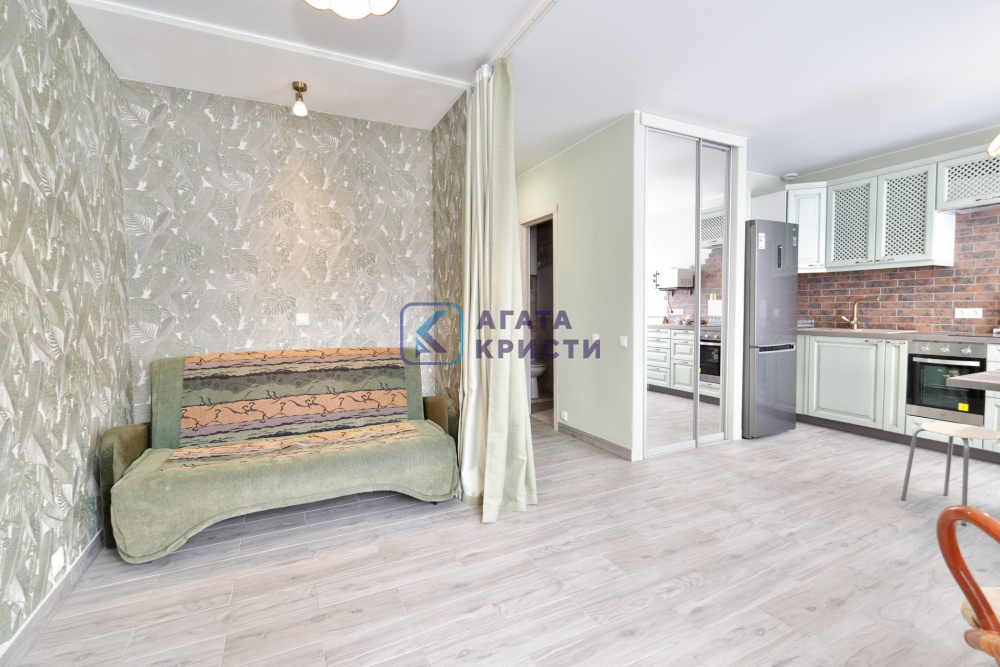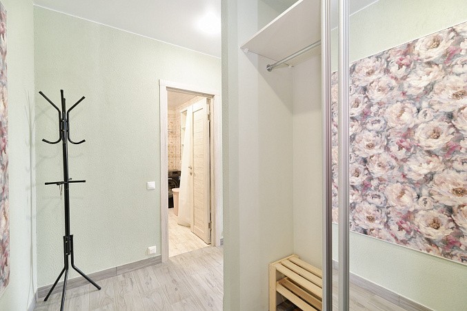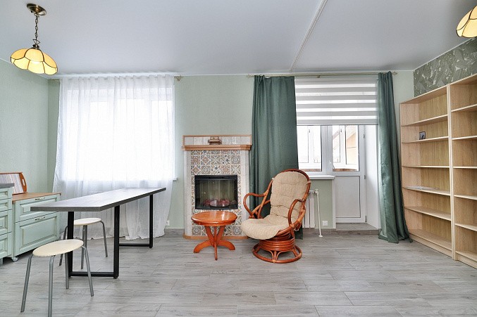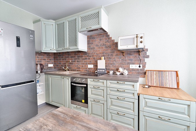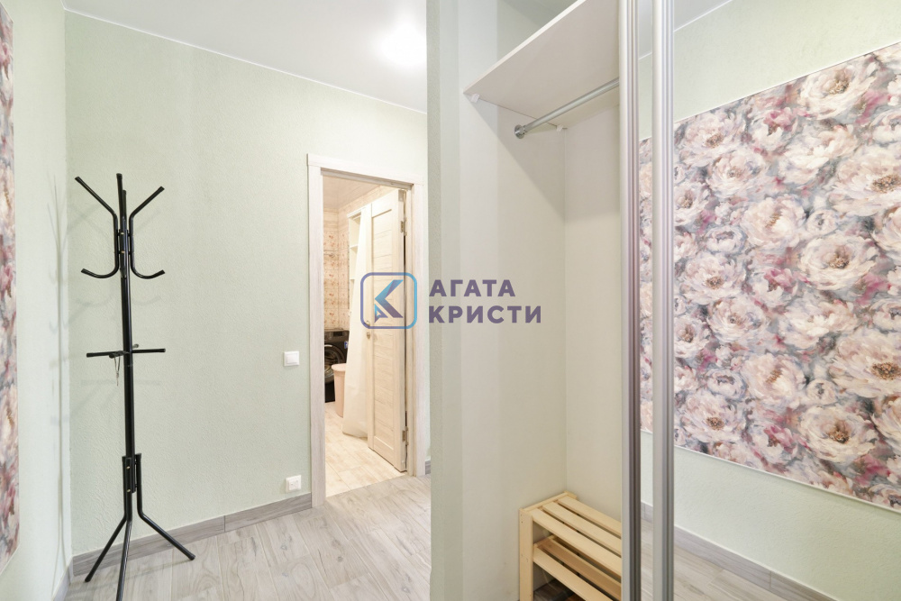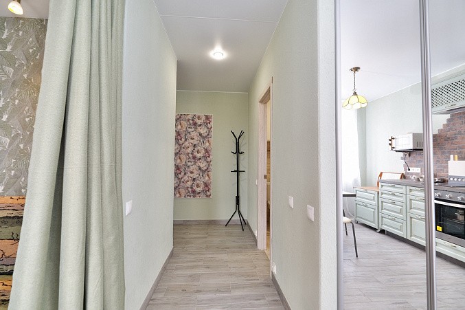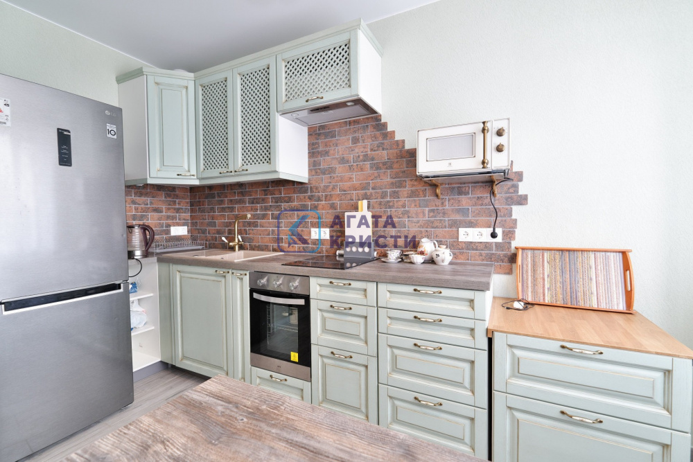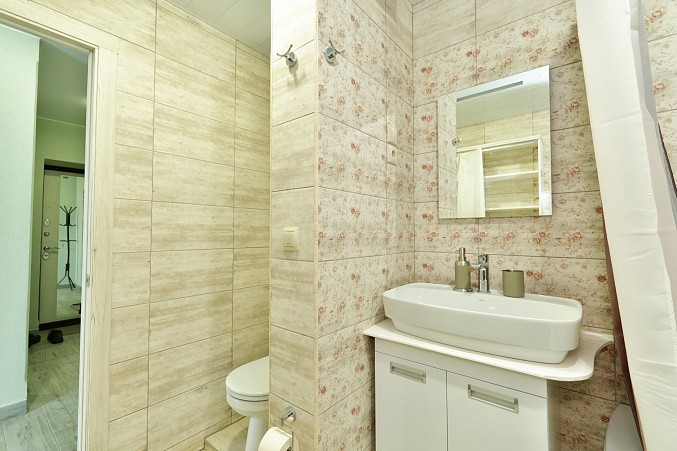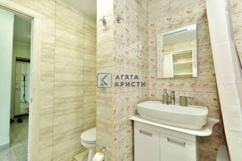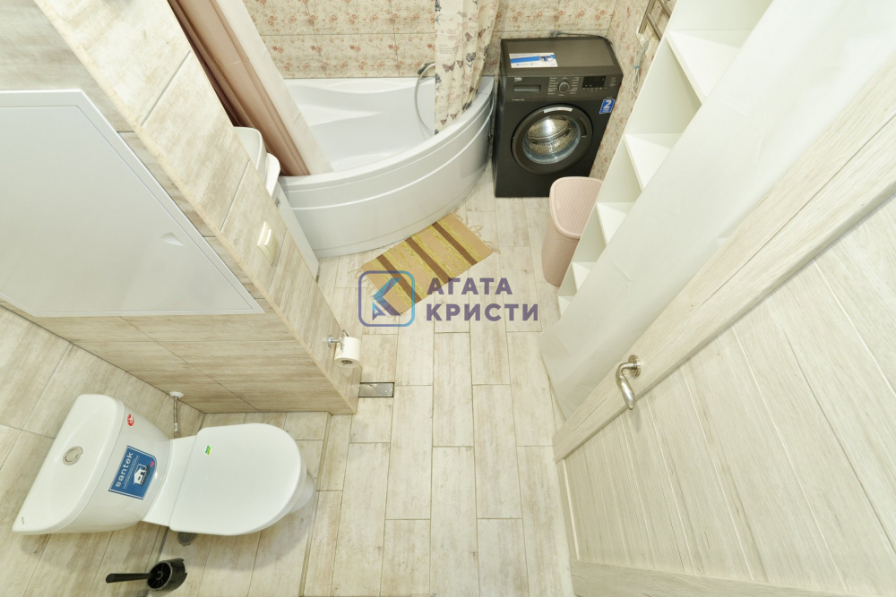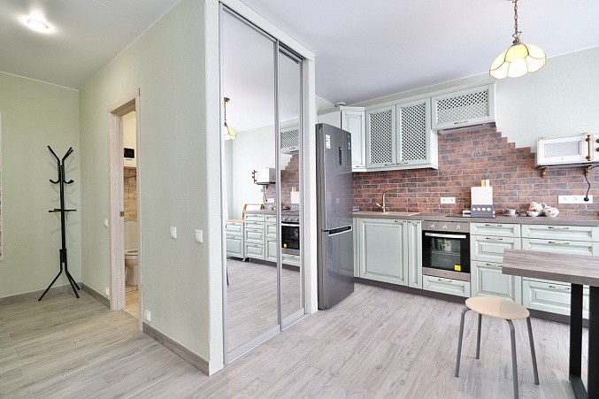 В квартире новая качественная дизайнерская отделка. Металлическая дверь, окна-стеклопакеты, на полах плитка с электроподогревом, на стенах декоративная штукатурка, обои. Есть зеркальные шкафы-купе, стильная кухонная мебель, холодильник, СВЧ-печь, духовка, электроплита, воздушный фильтр, вытяжка, обеденный стол с табуретами. Раскладной диван 160см. Электрокамин, ТВ, интернет, сушилка для белья. Санузел совмещенный, есть стиральная машина, накопительный водонагреватель, угловая ванна, умывальник с зеркалом, унитаз, шкаф с полками. Санузел снабжен поручнями для удобства маломобильных граждан.